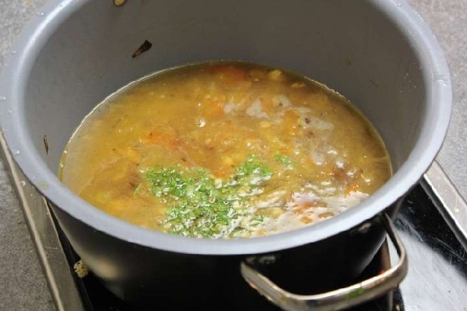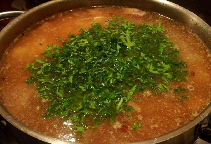 - Hak de gewassen en gedroogde kruiden fijn, voeg ze toe aan de soep en laat 2 minuten sudderen. Soep, na het koken, is het belangrijk om 15 minuten onder een gesloten deksel te staan om een rijke smaak te krijgen.