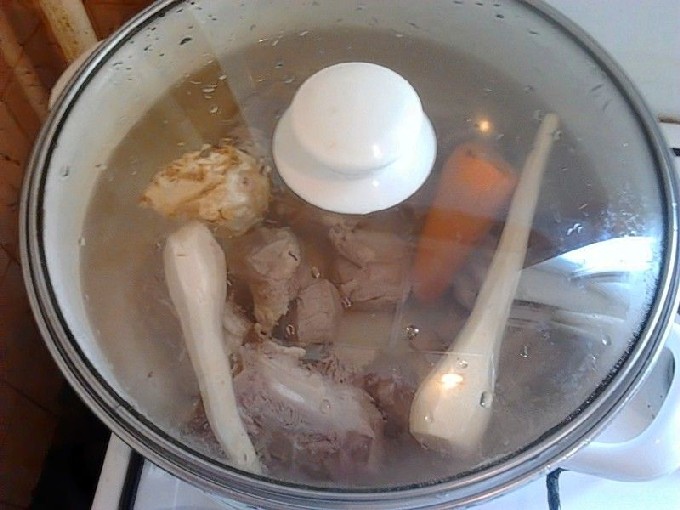 - Spoel het vlees en de pan, bedek met nieuw water, voeg pastinaak, bleekselderij, geschilde en hele mierikswortel, uien en wortelen toe. Verwijder na het koken het schuim en voeg kruiden, zout toe, zet het vuur lager, maar zodat het gorgelt. Kook gedurende 2 uur, tot het vlees gemakkelijk loslaat van het bot.