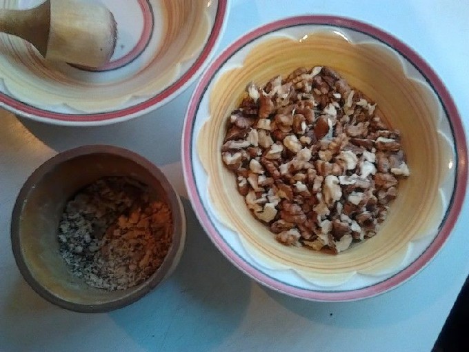 Maal de walnoten in een koffiemolen of blender. Pel de knoflook en plet in een vijzel. Meng met noten.