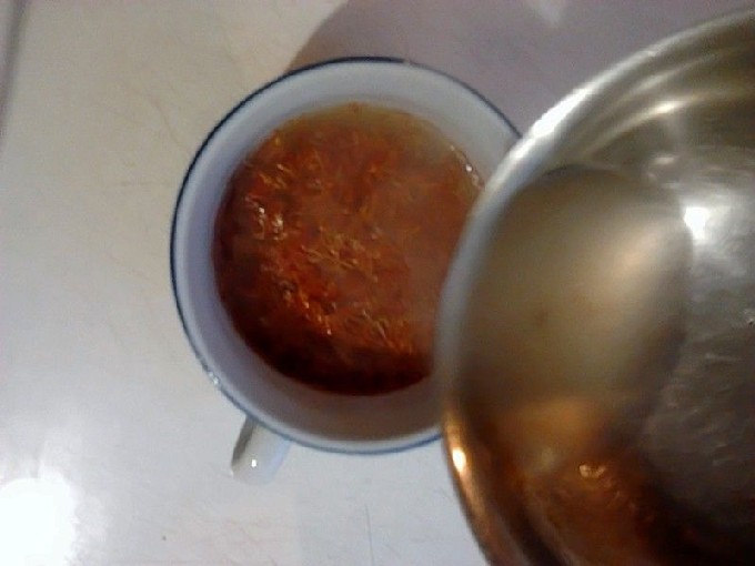 - Stoom de saffraan met kokende bouillon, dek af met een schotel gedurende 5-10 minuten. Als deze specerij niet wordt gevonden, kunt u deze vervangen door een mengsel van paprikapoeder en kurkumapoeder.
