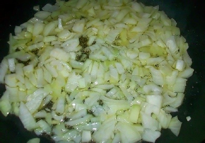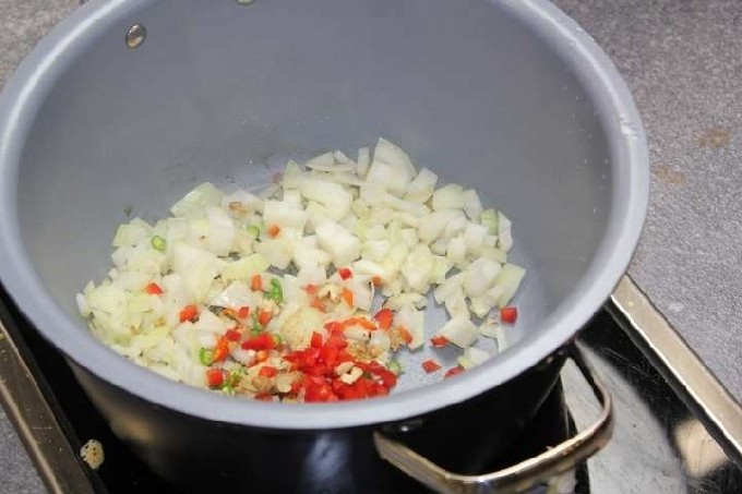 - Snijd een ui in kleine blokjes en hak de chilipeper fijn. Bak in een pan in olie.