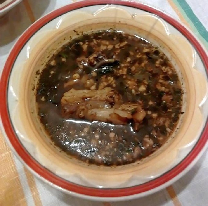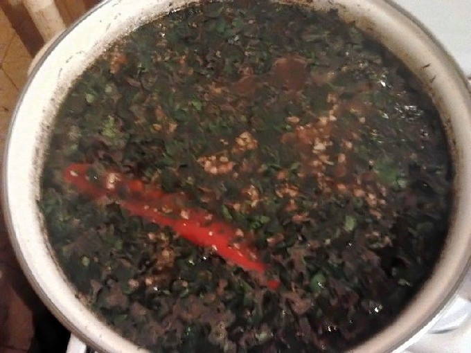 - Voeg tkemali-saus toe aan de soep. Breng gestoomde saffraan over, breng op smaak met suneli-hop. Hak de knoflook fijn. Hak de greens fijn en maal ze met zout.