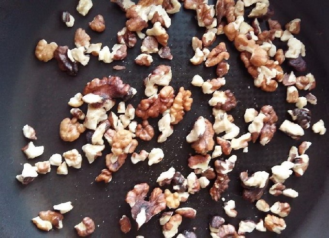 - Fruit de gesnipperde ui licht aan. Bak de noten in een droge koekenpan.