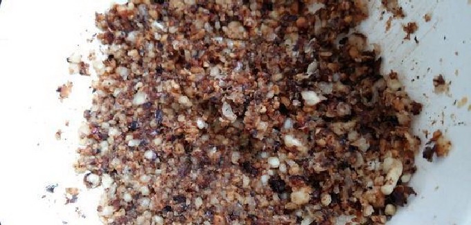 - Pel de teentjes knoflook en haal door de knoflook, combineer met de korrels van noten en maal tot pap.