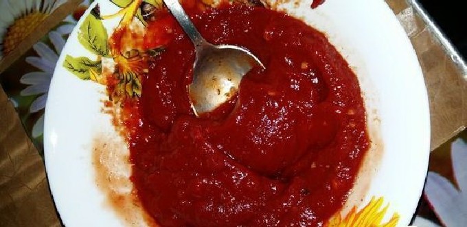 Laten we de kersenpruimpuree vervangen en tomatenpuree gebruiken, die de nodige zuurheid aan het gerecht zal toevoegen. Er zijn hier geen gefrituurde groenten, we kunnen kharcho koken met behoud van de maximale voordelen van groenten.