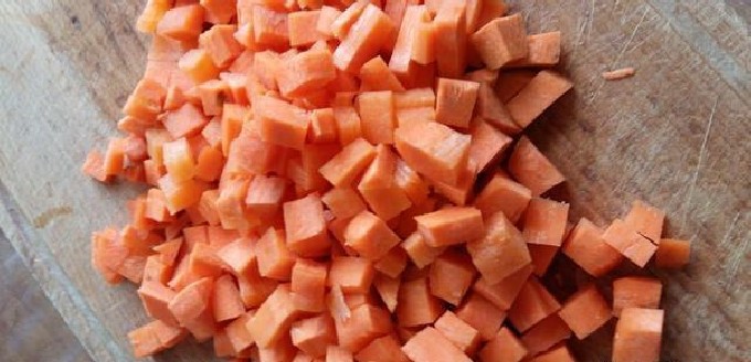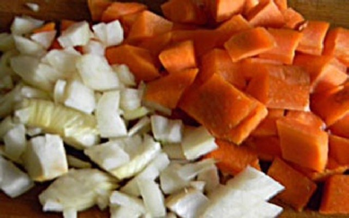 - Snijd de wortelen in blokjes en doe ze in een pan, stuur de uien daarheen, snijd ze in de lengte in ringen. Groenten 15 minuten koken