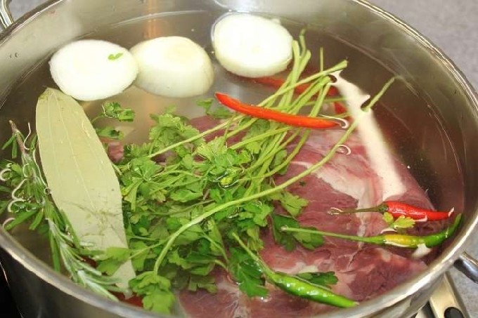- Spoel het vlees af en laat het in een diepe pan zakken, voeg 2,5 liter water toe, doe 2 koppen gepelde en gewassen uien, hele chilipepers en kruidentakken en kook tot het vlees zacht is.