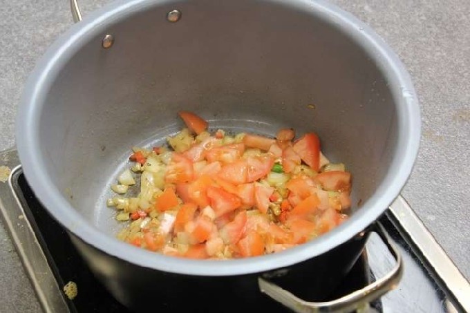 - Giet de tomaten 4 minuten met kokend water, dompel ze vervolgens onder in koud water en verwijder het vel. Snijd ze in kleine blokjes, doe ze in de pan en laat ze 15 minuten sudderen.