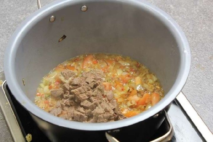- Snijd het rundvlees in middelgrote dobbelstenen, leg bij de groenten en laat een beetje sudderen.