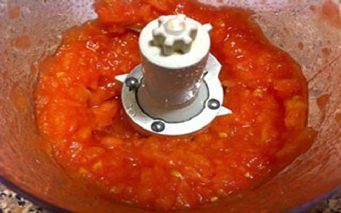 - Blancheer de tomaat in 0,5 liter kokend water, dompel hem na het maken van een kruisvormige incisie een minuut in ijswater. Verwijder de schil, breng het vruchtvlees over naar een blender en draai in aardappelpuree.
