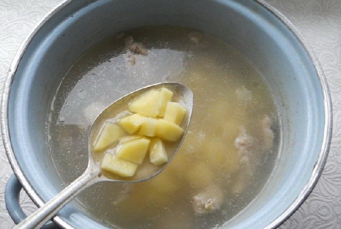 - Schil de aardappelen, was ze, snijd ze in lange staafjes en doe ze in de bouillon om te koken. Wanneer het kookt, breng de voorgewassen rijst en de inhoud van de pan, zout en kook gedurende 10 minuten.