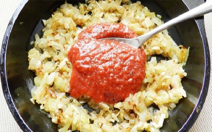 - Smelt de boter in een hete koekenpan, voeg de knoflook toe en voeg na een minuut de ui toe. Wanneer een smakelijke gouden kleur verschijnt - voeg toe, meng adjika en tomatenpuree, laat 5 minuten sudderen onder een gesloten deksel. Voeg de geraspte wortel toe en laat nog 3 minuten sudderen. Doe de kruiden erbij en zet ze na 3 minuten uit.