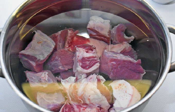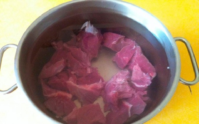 - Neem het vlees, spoel het af, droog het af met keukenpapier en snijd het in stukken ter grootte van een luciferdoosje. Botten hoeven niet te worden gesneden. Doe het vlees in een pan en giet water, bedek het vlees, zet op het vuur tot het kookt. Giet het eerste water af, er kunnen schadelijke stoffen in zitten.