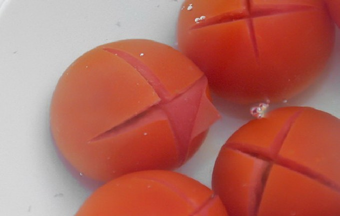 - Verwijder de schil van de tomaten, maak hiervoor een insnijding met een kruis en dompel deze onder in kokend water, na enkele minuten begint de schil af te schilferen.