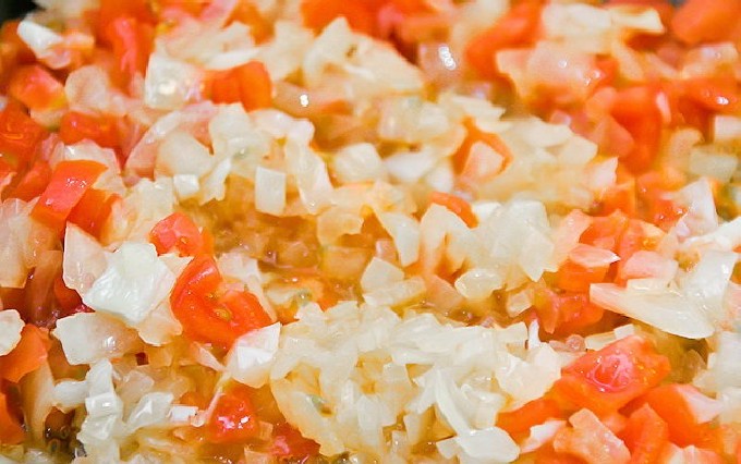 - Pel de ui, hak ze fijn en bak ze in boter. Snijd de tomaten heel fijn en leg ze bij de ui.