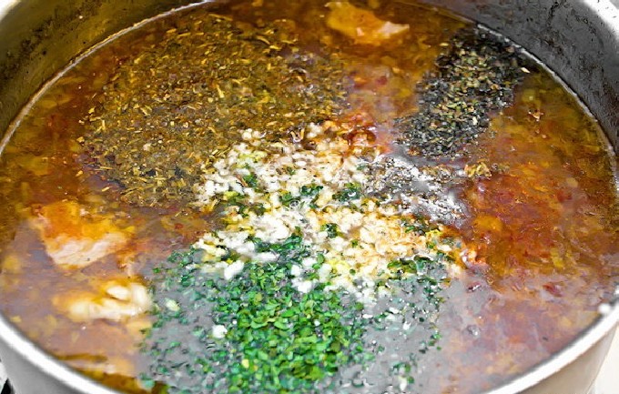 - Als de rijst klaar is, voeg je kruiden en knoflook toe aan de kharcho. Houd het een minuut in brand en zet het uit.