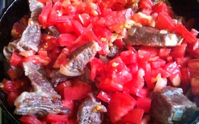- Haal het gekookte vlees van het bot, scheur het in stukken en doe het terug in de pan. Voeg er tomaten aan toe en laat 10 minuten in brand staan.