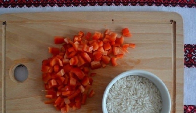 Spoel de rijst en paprika apart af, verwijder de zaadjes uit de paprika en snij in kleine blokjes.