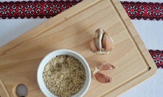 - Pel de knoflook, voeg droge koriander toe en overgiet met 1 el. ik. zonnebloemolie. Snijd de koriander fijn en meng met knoflook en kruiden.