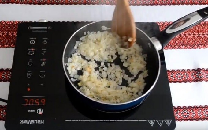 Pel de ui, spoel af en snij in kleine blokjes. Bak in een hete koekenpan met hete olie. Bak tot ze goudbruin zijn, af en toe roeren.