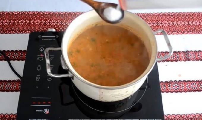 Doe 3 eetlepels tkemali en kruiden in een pan. Spoel een klein bosje koriander onder stromend koud water, hak het fijn en voeg het toe aan de pan. Zout ½-1 theel. zout, roer en kook. Onthoud dat wanneer de soep afkoelt, het zout meer uitgesproken zal aanvoelen, dus overdrijf het niet. Kook afgedekt 5 minuten.