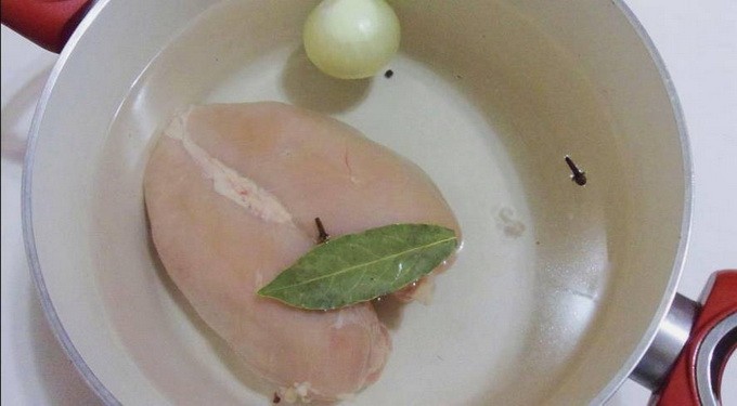 - We wassen de kipfilet, verdelen hem indien nodig in verschillende delen en sturen hem naar een pan met water, uien, laurierblaadjes, kruidnagel en zwarte peperkorrels. Kook de bouillon op basis van deze ingrediënten gedurende 35-40 minuten.