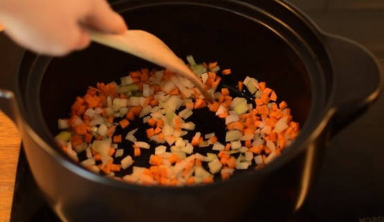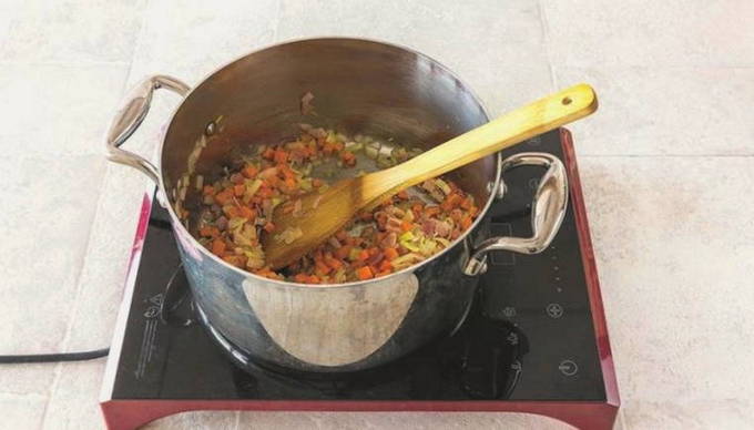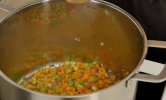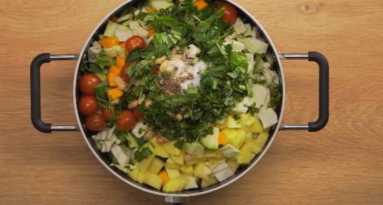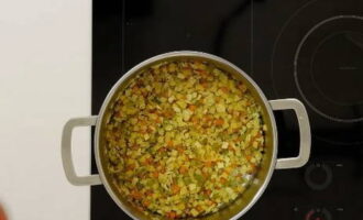 - Na het roeren van de inhoud van de pan, blijven we de groenten vijf minuten sudderen, zonder het vuur te verhogen.