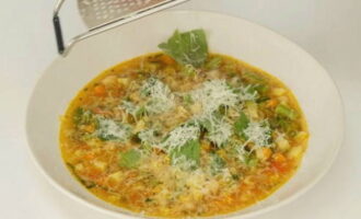 Omdat we Parmezaanse kaas nodig hebben om te serveren, wrijf je een stuk op een grove rasp en laat je het tot gebruik in de koelkast staan. We controleren de gereedheid van alle groenten en zetten de minestrone uit. Na het uitschakelen de pan afdekken met een deksel en de soep ongeveer 10 minuten laten trekken.Doe geraspte Parmezaanse kaas in elke portie van de soep en serveer.