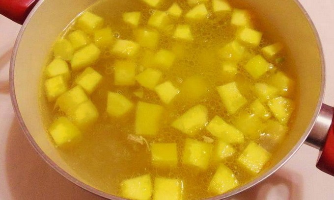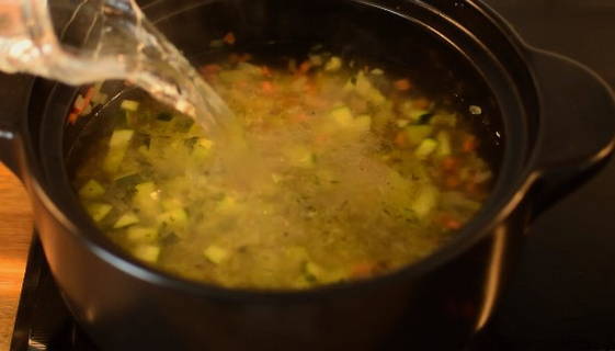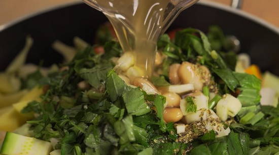 - Vul groente frituren met verwarmde bouillon en stuur op middelhoog vuur. Als de inhoud van de pan kookt, zet je het vuur iets lager en voeg je de olijfolie toe. Kook gedurende 15 minuten.