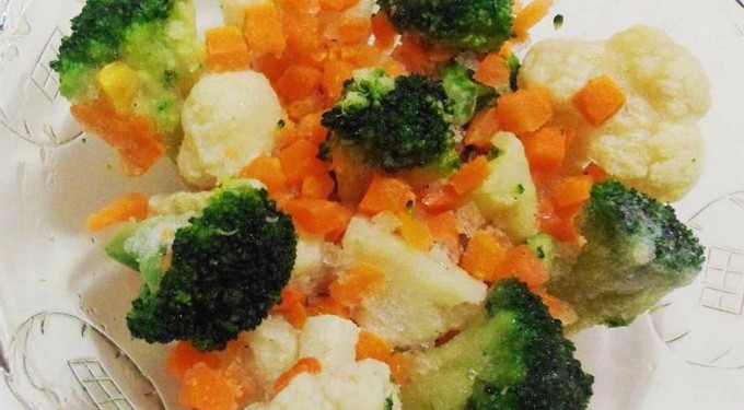 - Allereerst ontdooien we het gekochte groentemengsel, spoelen het af onder stromend water en laten het een beetje drogen.
