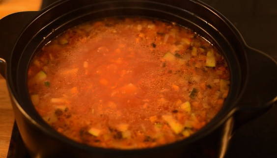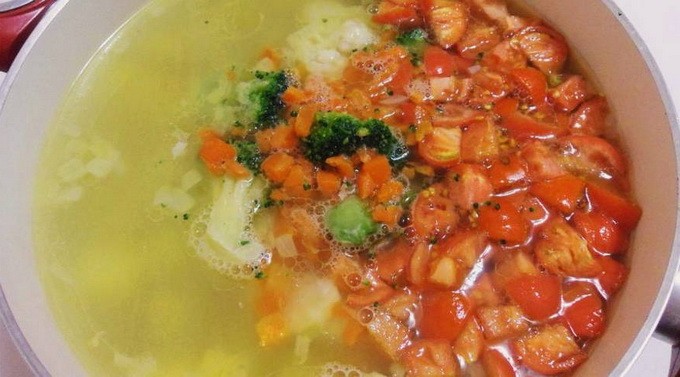 - Bak tot slot de prei met tomaten. Dus de ingrediënten zullen meer sap en smaak afgeven. Giet volgens het oude schema de ui met tomaten met water en doe het in een pan met groenten, voeg de pasta toe. Breng de soep aan de kook en kook 5 minuten.