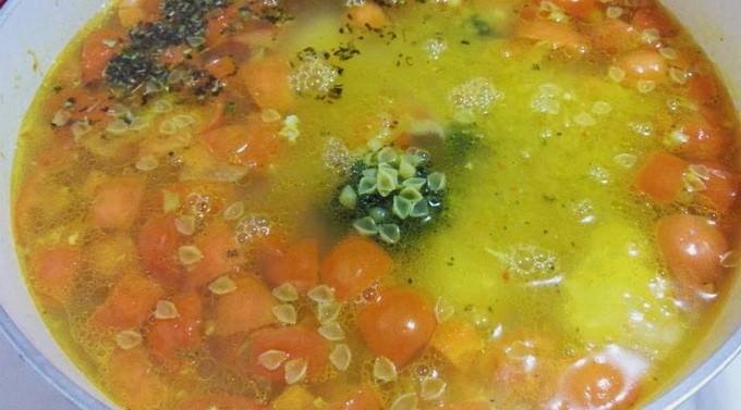 - Voeg 5-10 minuten voor het uitschakelen de pasta toe zodat ze niet te gaar worden. Meng alles goed en kook onder een gesloten deksel. Serveer warme soep, garneer eventueel met geraspte kaas.