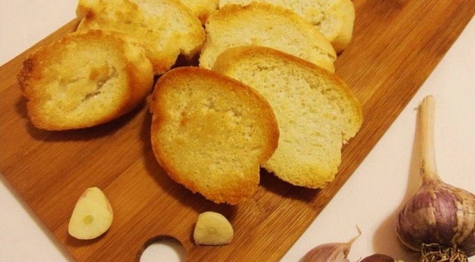 - We pellen de teentjes knoflook en wrijven het gebakken stokbrood ermee in zodat het zoveel mogelijk verzadigd is met dit aroma.