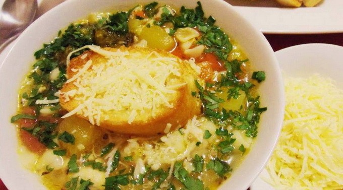 En ook jij wist niet dat minestrone met kip gebeurt, dan is het tijd om kennis te maken en zo'n diner voor jezelf en je dierbaren te maken. Gefrituurde, sappige groenten worden naar kippenbouillon gestuurd en doordrenken met hun aroma. Om de soep nog gevarieerder te maken, gaan we knoflookbruschetta op stokbrood bereiden. Een lichte, stevige en tegelijkertijd gezonde lunch wordt voor je verzorgd.
