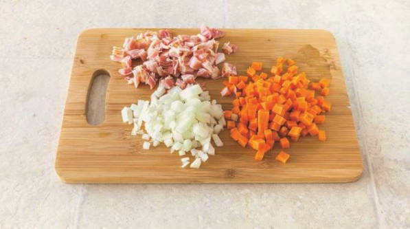 - Italiaanse minestronesoep bevat een enorme verscheidenheid aan ingrediënten, die elk op de juiste tijd moeten worden gebruikt. Schil de wortelen en uien, spoel ze af en snijd ze zo nauwkeurig mogelijk in kleine blokjes. Maar met courgette en spek kun je niet veel schelen en snijd ze veel groter.