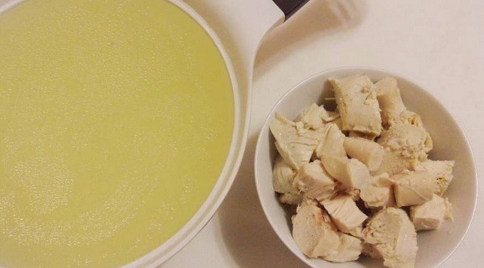 - Zeef de afgewerkte bouillon en snijd de kipfilet in kleine blokjes.