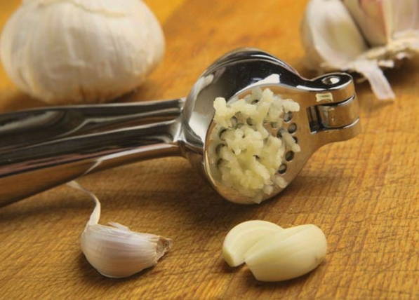- Snijd de stengel bleekselderij in dunne plakjes, hak de gepelde knoflookteentjes fijn en haal ze door een pers. Indien gewenst kunt u eenvoudig met een mes snijden en aandrukken.