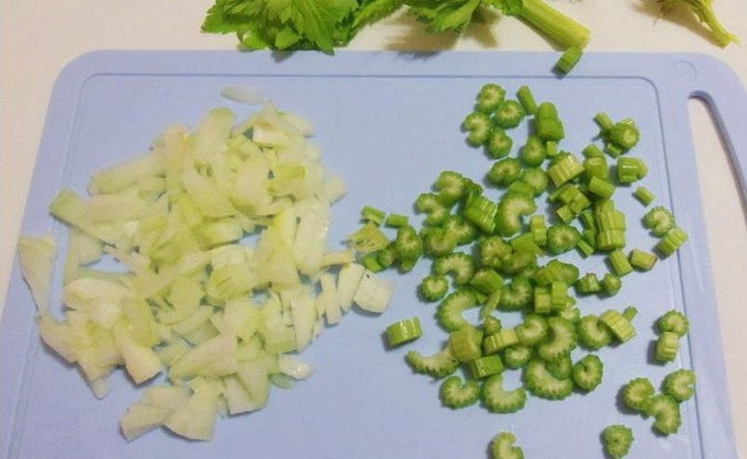 - Verwijder de schil van de tweede ui en snijd deze in kleine blokjes. Snijd ook de stengels bleekselderij zo klein mogelijk.