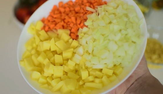 Om het proces op rolletjes te laten verlopen, bereiden we alle groenten voor het koken voor. Was de ui, wortel en knolselderij grondig, schil en snij in vrij kleine blokjes.