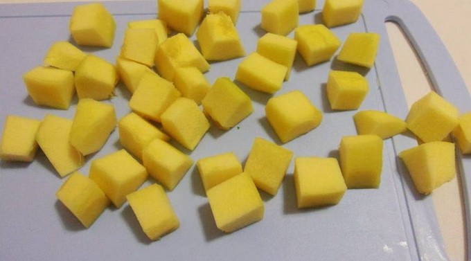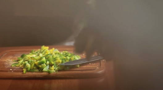 - Allereerst wassen we de zoete paprika en snijden hem vervolgens in de lengte in twee delen. Snijd na het verwijderen van de kern met zaadjes het vruchtvlees van de paprika in zo klein mogelijke blokjes.