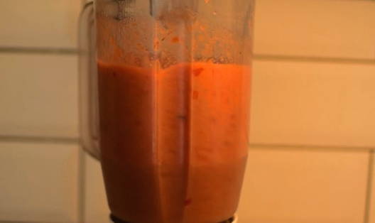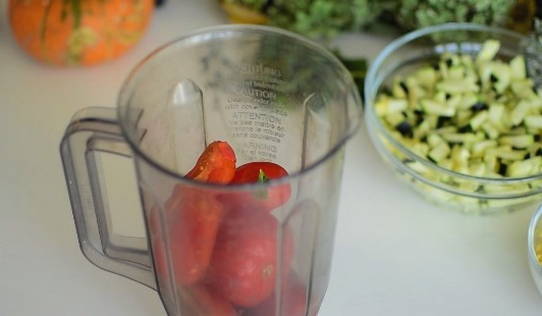 - Terwijl onze groenten stoven, maken we een tomatendressing. Snijd de voorgewassen tomaten in kleine plakjes en laat ze in de blenderkom zakken. Klop alles tot het volledig homogeen is. Voeg desgewenst een beetje zout of suiker toe aan de tomatenbasis, waarbij u zich richt op de smaakkenmerken van uw tomaten.