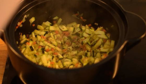 - Tegen die tijd zijn de wortelen en uien veel zachter geworden en is het tijd om courgette naar hen te sturen. Ook in dit stadium voegen we Italiaanse kruiden toe zodat de componenten onmiddellijk verzadigd zijn met een ongelooflijk pittige smaak en aroma.