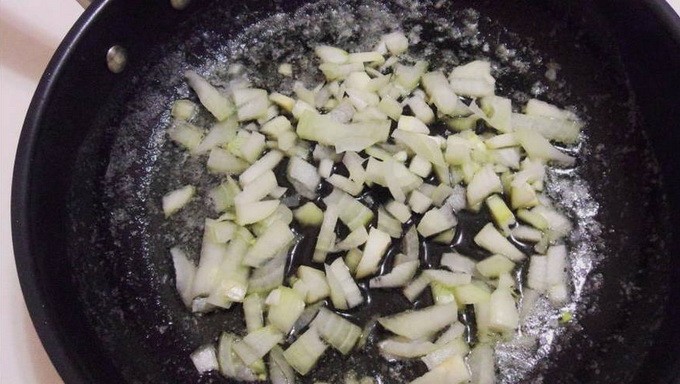 - Het is tijd voor een warmtebehandeling. Verhit een koekenpan met olijfolie en fruit de gesnipperde ui glazig.