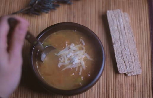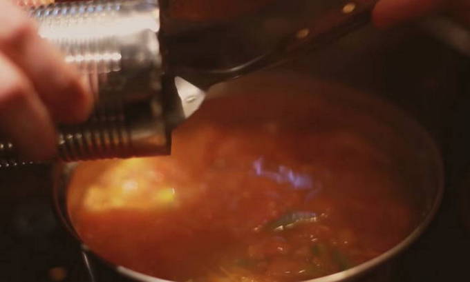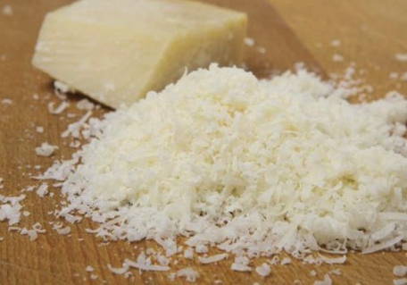 - Ondertussen wrijven we Parmezaanse kaas in, die later niet alleen onze soep zal versieren, maar ook een licht romige smaak zal geven.