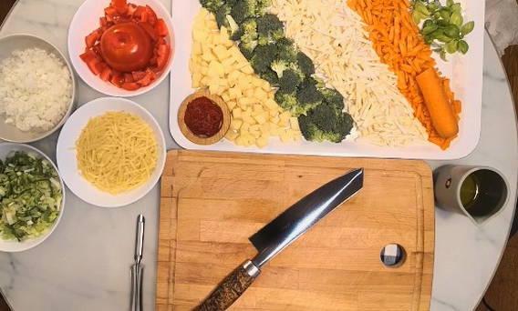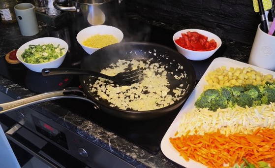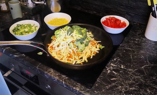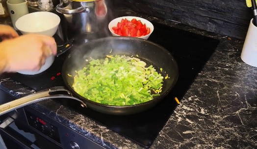 - Misschien is dit heel ongebruikelijk, maar voeg de ui toe nadat de groenten licht gestoofd zijn. Voeg na de ui de resterende gesneden groenten en hele cherrytomaatjes toe.