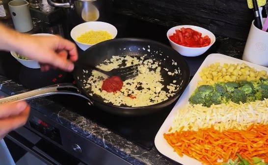 - Leg na de ui een beetje tomatenpuree en roer alles goed door. We laten de inhoud heel kort sudderen, zodat de pasta niet verbrandt en geen overmatige bitterheid geeft. Giet vervolgens de ui, gebakken in tomatenpuree, met water en breng over naar een pan.