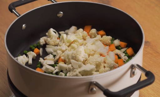 - Als je groentebouillon klaar is, gaan we meteen over tot de bereiding van groenten. Als je diepvriesgroenten gebruikt, ontdooi ze dan eerst en spoel ze af. Wij schillen verse groenten en snijden ze op een voor u geschikte manier. Verhit vervolgens een koekenpan met olijfolie en doe de erwten, wortelen, bloemkool en broccoli erin.