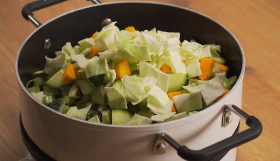 - Giet gehakte courgette in een pan met groenten en laat een paar minuten op laag vuur staan.