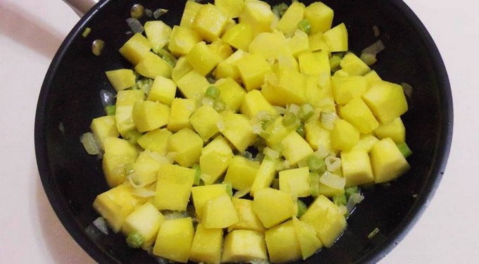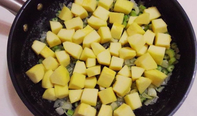 Giet vervolgens olijfolie in een diepe pan en verwarm deze op laag vuur. We sturen groenten naar de verwarmde olie om te worden gebakken. Voeg na ongeveer vijf minuten zout, zwarte gemalen peper, een fijngehakt takje rozemarijn toe en bak ze verder tot ze een aangename gouden korst hebben.