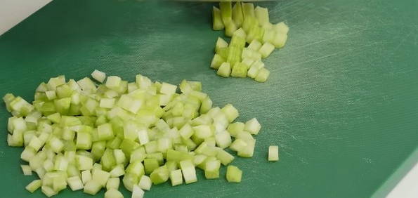 - Verwijder de schil van de tweede ui en snijd deze in kleine blokjes. Snijd ook de stengels bleekselderij zo klein mogelijk.